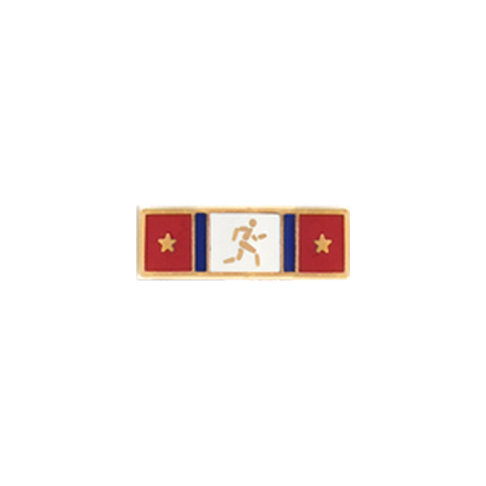 This impressive five section commendation bar features a runner in the center section and a star on each end. This bar can be customized with the colors of your choice, and can be used to symbolize a fitness award. If this bar is needed to fit in a bar holder, use model A12226 (3/8"). The symbol(s) are built into the die and cannot be changed.