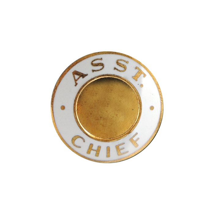 Handsome Assistant Chief disk shown with an applied ½” seal in the center. This versatile piece can be used as a lapel pin by adding two clutch back nail attachments, or use it as a stunning center seal on your badge.
