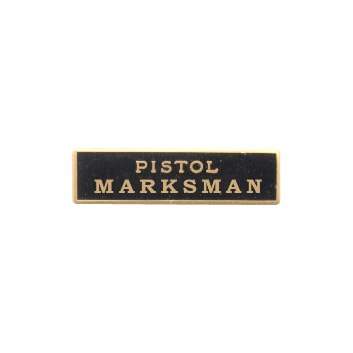 Quality Pistol Marksman enamel marksmanship bar. This stunning bar can take the enamel color of your choice. The wording is in the die and cannot be changed.