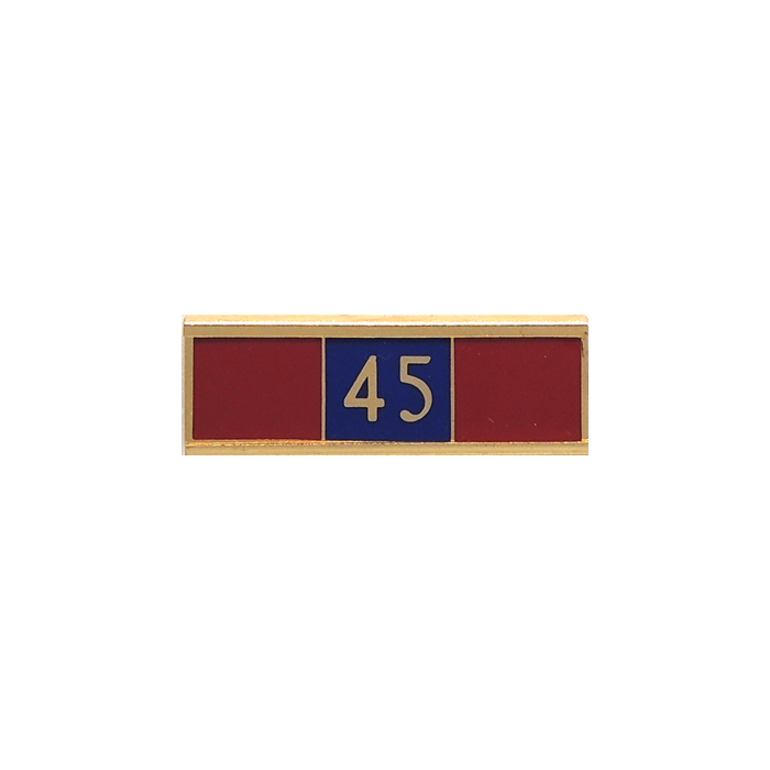 This impressive three section bar with a 45 in roman font in the middle section can be customized with your selection of colors to symbolize exemplary service, appointment to a group or team, 45 years of service and much more. The number is in the die and cannot be changed. This bar is available in block font. See model A7142-AF.