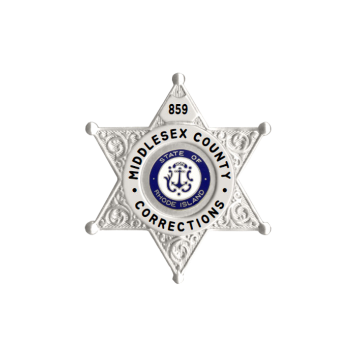 This intricately-detailed upside down version six-point star badge features balled star point tips, a round center ring for lettering, and an additional lettering space across the top star point too!