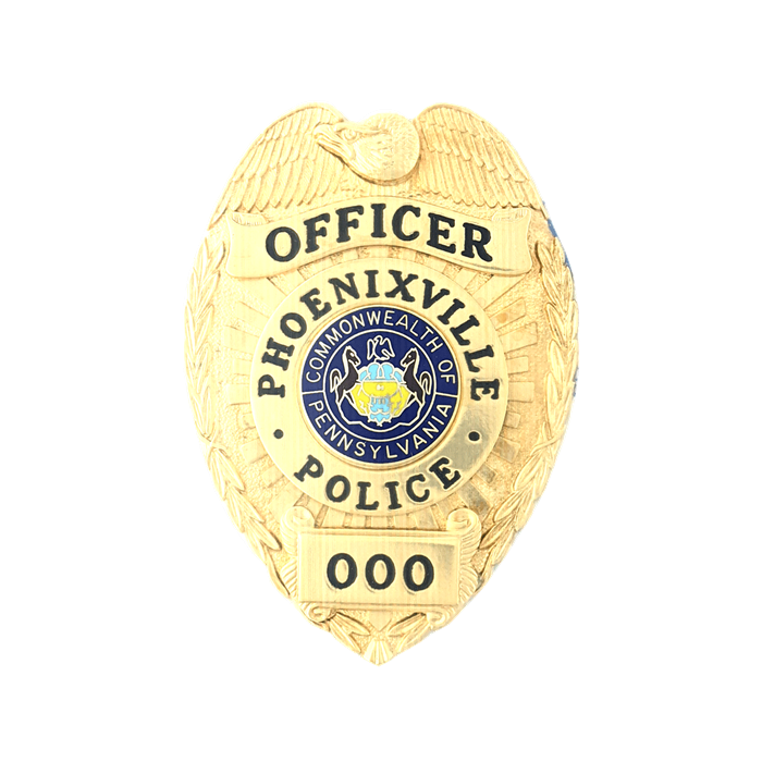 This spacious shield badge features an eagle with an applied head on the top as well as plenty of room for lettering on applied panels and center disc.