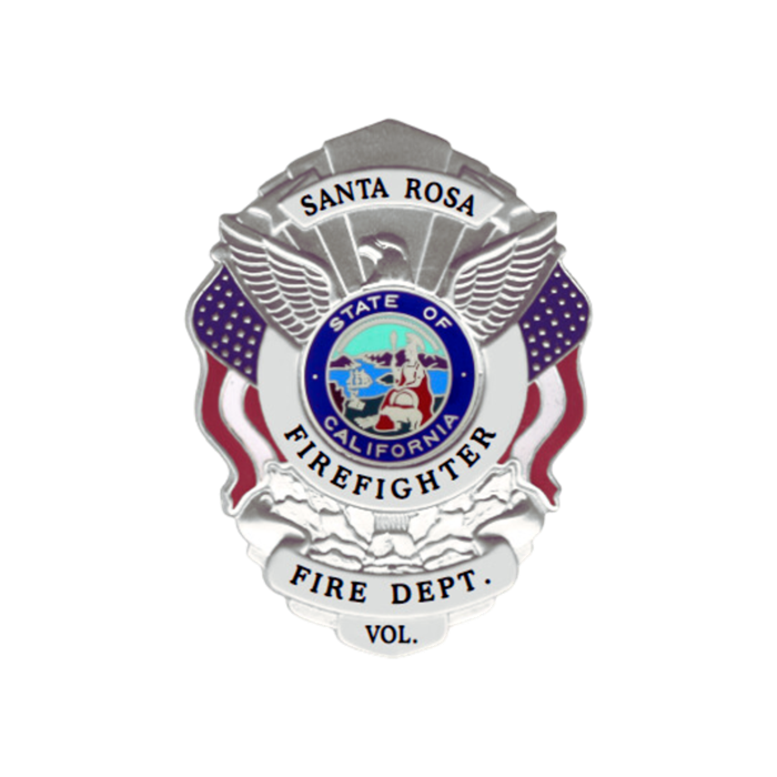 This beautiful badge incorporates a proud eagle, sunburst rays, and flowing American flags!