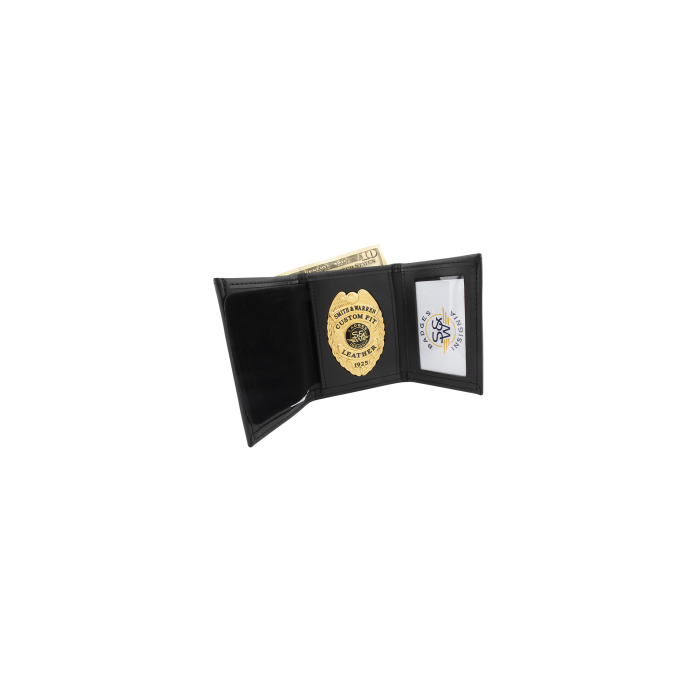 The bill-fold section in this dress leather wallet is tri-fold and the ID compartment is permanently attached on the right side. The badge is recessed and well concealed in the center and can be exposed as needed. To the left of the badge, you can store up to 3 credit cards. This wallet is supplied with a picture sleeve.
