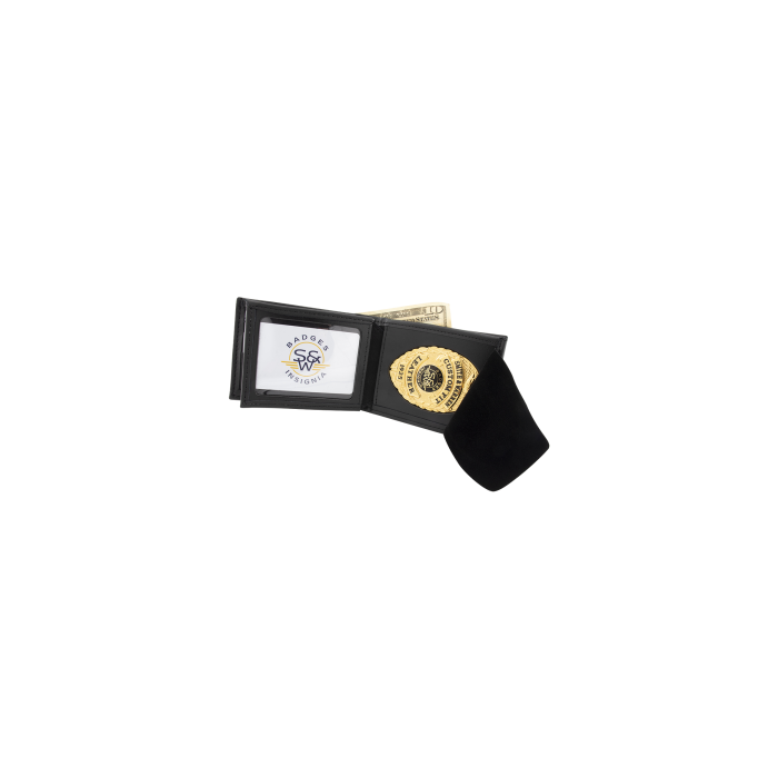 This dress leather notepad style wallet is an excellent choice. Badge in this bi-fold wallet is concealed. 6 credit card slots, as well as a flipping ID window, are included. There is plenty of space in this wallet to store currency, badge, ID and credit cards. The wallet is supplied with a picture sleeve.