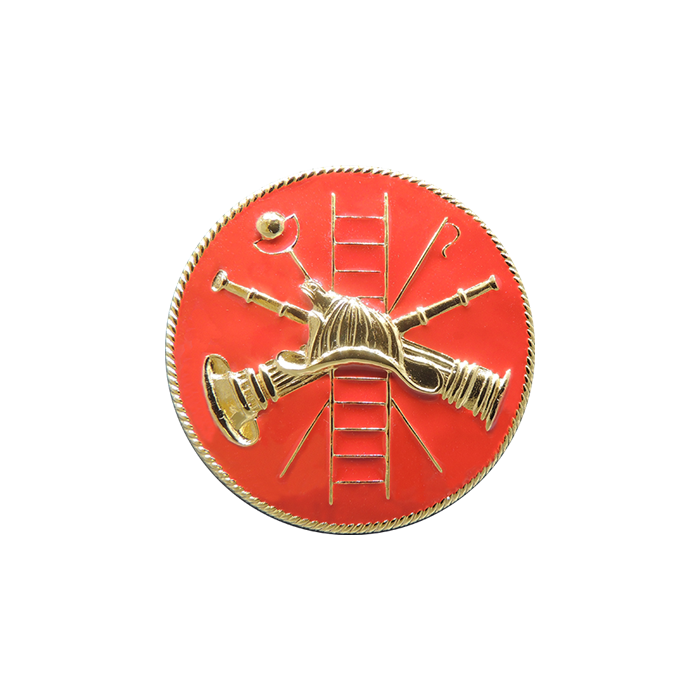This robust cap badge is over 1.5" wide and features a detailed scramble of a helmet, ladder, horn and more! Features enamel coloring of your choice!