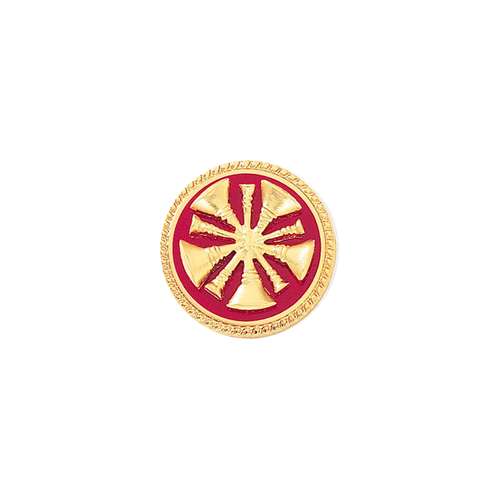 Handsome enamel disc with a rope border shown with a A2905 bugle cut out applied. This piece of insignia can not be applied to a badge. Five crossed bugles (Shown) typically denotes the fire rank of Chief / Commissioner. 1 1/16" PLEASE SPECIFY HORNS to be applied. Collar insignia only; cannot be used as badge center.