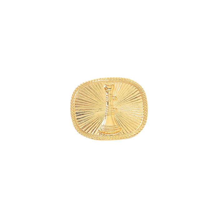 This proud cap badge features a single vertical right-facing horn with sunburst background on a rounded yet rectangular presentation all encompassed by a detailed rope rim!