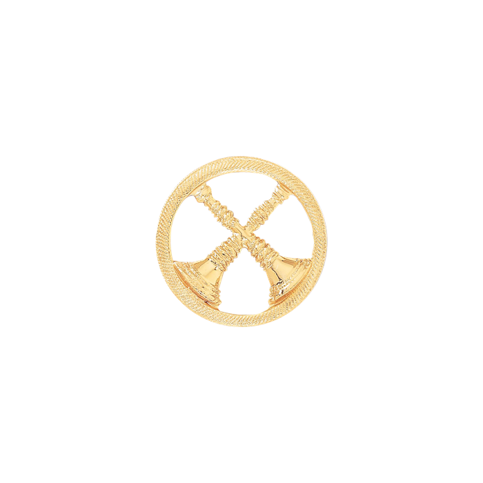 This intricate cap badge for a Captain is very similar to our A2911, featuring two crossed horns and a thick rope rim yet now with the spaces between the horns removed! You can also order this with an applied round CAPT. center too!