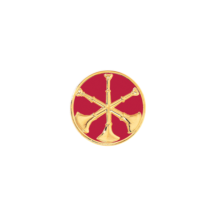 This intricate cap badge for an Assistant Chief is very similar to our A2910, featuring three crossed horns yet with a thinner and polished rim plus a simplified horn design! Additionally, this product features your choice of enamel background coloring!