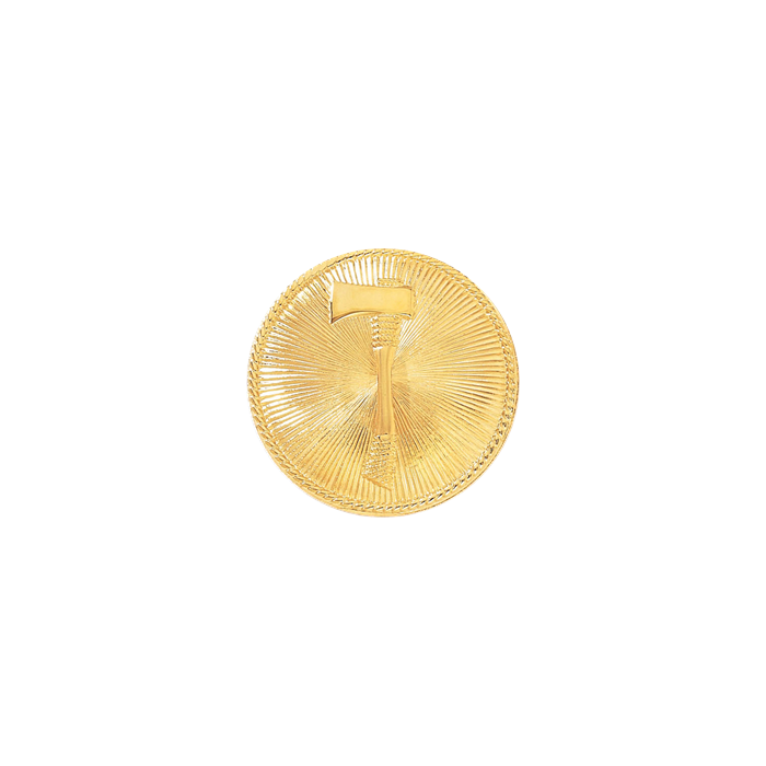 This classic cap badge features a rope rim surrounding a vibrant sunburst background and precisely-detailed single axe at center!