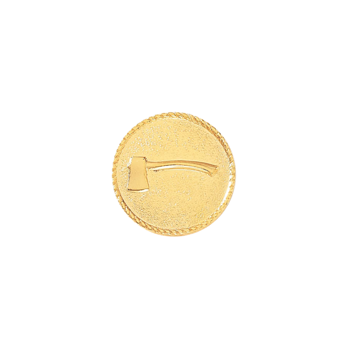 Plain seal featuring a single ax facing down with a decorative rope border. This handsome seal can be used as a lapel pin, or use it as a stunning center seal on your badge. For an axe facing down to the Right, use model A3732. This seal is available as a hat / cap badge. See model A2892. Minimum order quantity is 2.