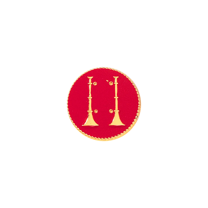 Handsome seal featuring 2 raised vertical bugles and a rope edge. This versatile piece can be used as a lapel pin by adding two clutch back nail attachments, or use it as a stunning center seal on your badge. The background can be the flowed enamel color or your choice. Two vertical horns typically denotes the fire rank of Captain. Also available is 11/16" A7208, 5/8" A6982, 1/2" A6983, and 5/16" A6984. Minimum order quantity is 2.