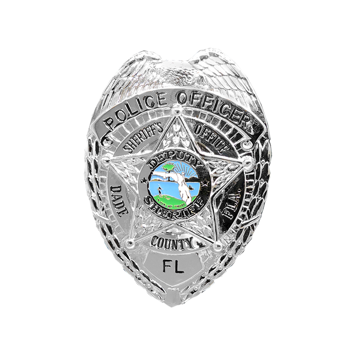 This is the badge for the Dade County Sheriff's Office in Florida! Featuring a background shield and eagle with a foreground five-point star. The star and seal are in the die along with the words Sheriff's Office, Dade County FLA. Only the top and bottom panels can be engraved with the text of your choice.