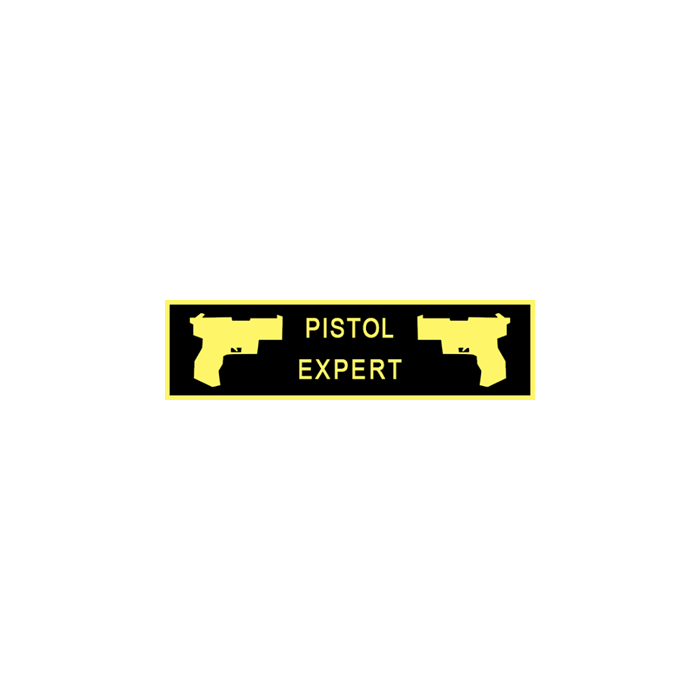 Pistol Expert one color commendation bar with pistols on each side of lettering. Pistols and lettering are built into the die and cannot be changed. For "Pistol Marksman", use model A12930.