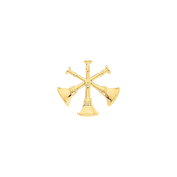 This exquisite lapel pin features three crossed bugles and typically denotes the fire rank of Division Chief or Deputy Assistant. Sold In Pairs. Available in gold or silver with clutch back attachment(s). For more options and features, see model A2907.