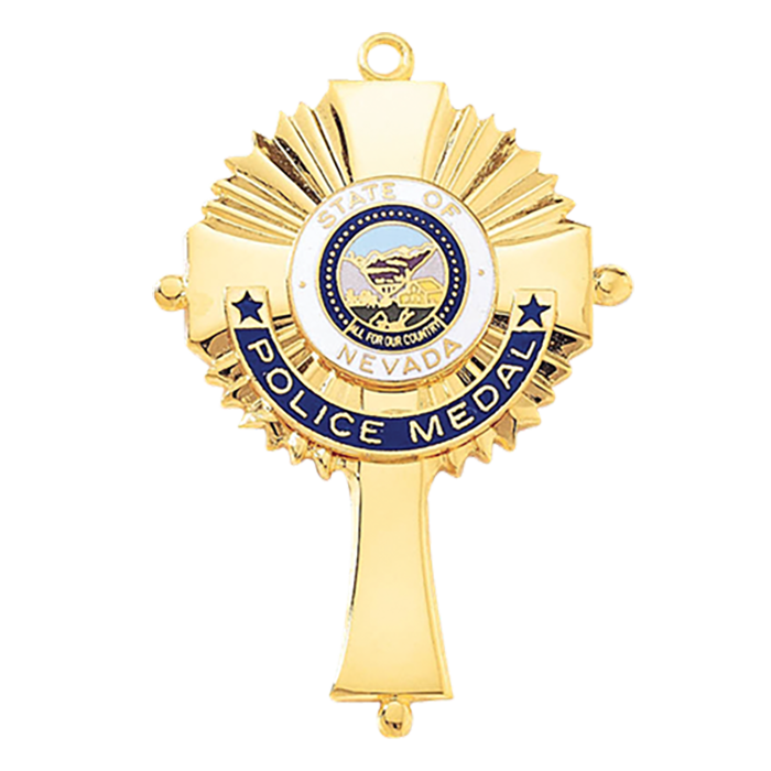 Exquisite circular medal with a cross. The medal is pictured as a police medal, but you can customize it with your choice of lettered panel (we have most commonly used titles) and the seal of your choice. All our medals are provided in a rich, dark blue velour case at no additional cost, matching commendation bars are sold separately.