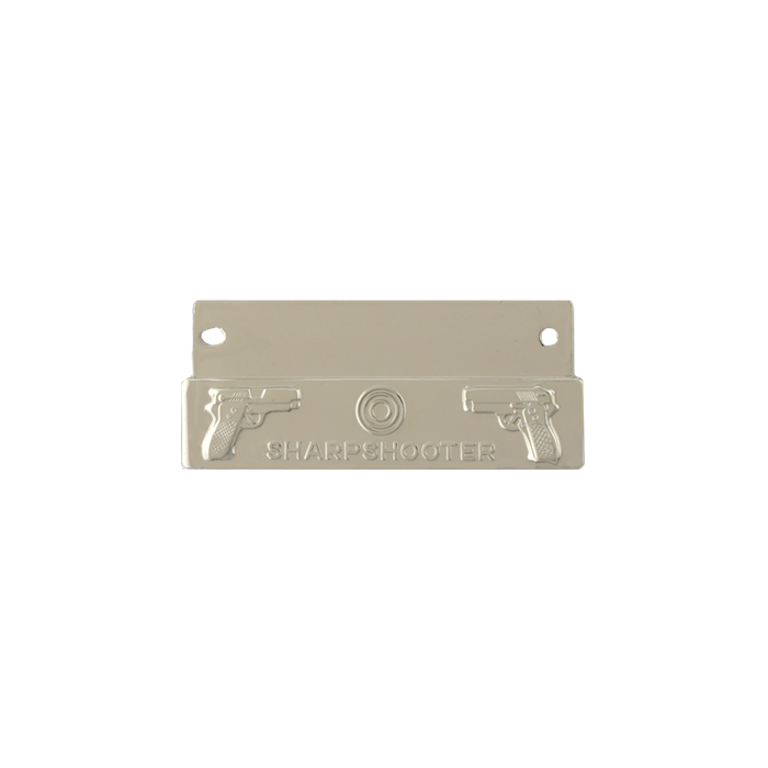 Quality Sharpshooter marksmanship bar holder. This stunning bar holder has Sharpshooter and a target with two pistols in the die. The holder holds a bar that is at least 1-5/8" (1.625") wide as that is the distance between the two holes for the nails.