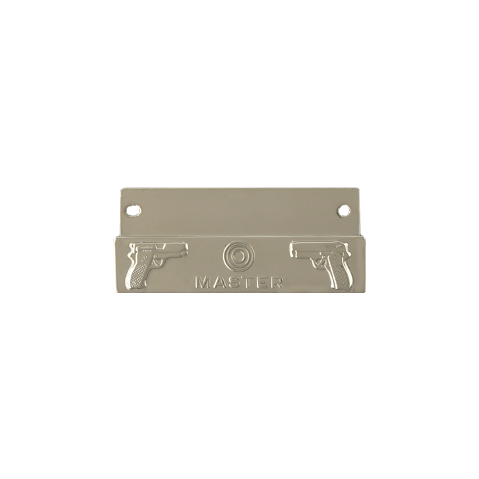 Quality Master marksmanship bar holder. This stunning bar holder has Master and a target with two pistols in the die. The holder holds a bar that is at least 1-5/8" (1.625") wide as that is the distance between the two holes for the nails.