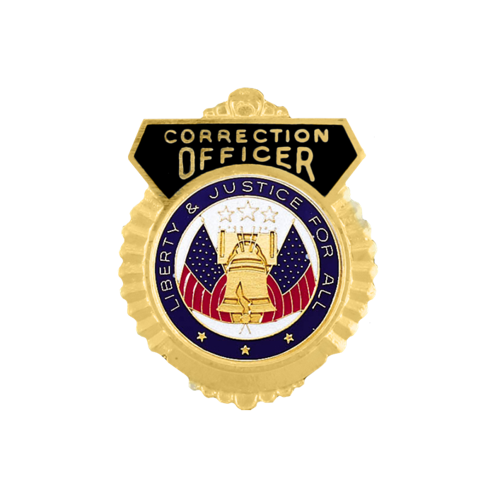 Exquisite Correction Officer tie tac which can take the enamel color of your choice behind the letters, and any 1/2" seal. The bottom panel can have up to 9 engraved characters. Available as a Tie Bar (A4002-BTC).