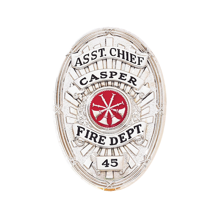 This popular oval badge features large and bold sunburst rays as well as plentiful room for applied panels and a seal too! Solid Back Badge. This badge is available with a colored enamel background. See model A6148-DE.