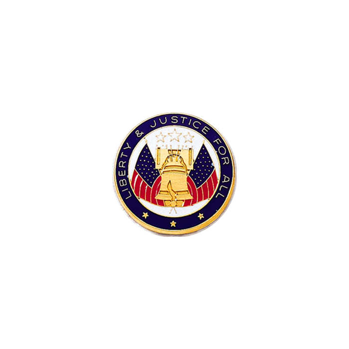 Handsome 1-1/8" Liberty and Justice For All seal with liberty bell and American Flags. This is only available in the colors shown. This versatile piece can be used as a lapel pin by adding two clutch back nail attachments (Quantity 2 Style# F9), or use it as a stunning center seal on your badge. Also available as 15/16" style A6958, 13/16" style A7647, 11/16" style A6959 and 1/2" style A6960. Minimum order quantity is 2.