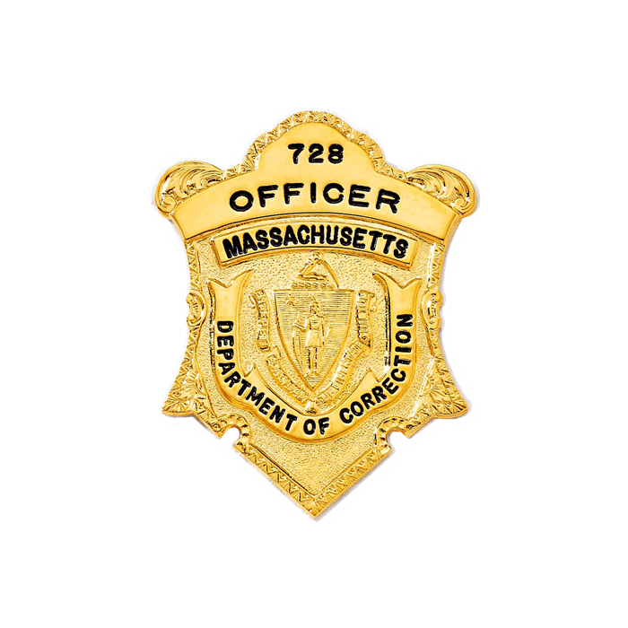 This beautiful shield badge features the Massachusetts state seal in the center as well as three large panels for lettering! Mass. Coat of Arms in die and cannot be changed. For badge that can take a center seal, use model B1344-D. Solid Back Badge.