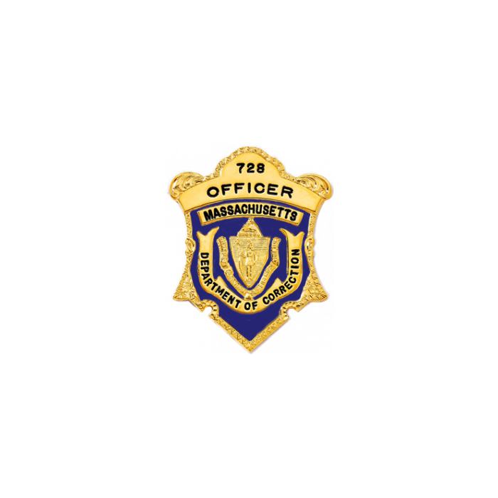 This beautiful shield badge features the Massachusetts state seal in the center as well as four large panels for lettering! This version includes enamel coloring of your choice in the background! For badge without background enamel, use model B1311. The Massachusetts Coat of Arms is built into the badge and cannot be changed.
