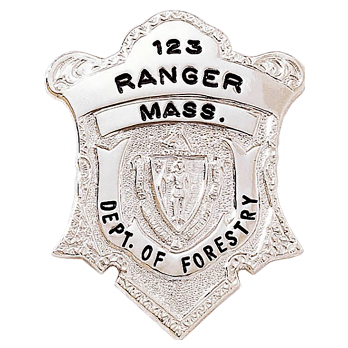 This beautiful shield badge features the Massachusetts state seal in the center as well as three large panels for lettering! Mass. Coat of Arms in die and cannot be changed. Seal may be applied over seal in die, if you indicate in special instructions.
