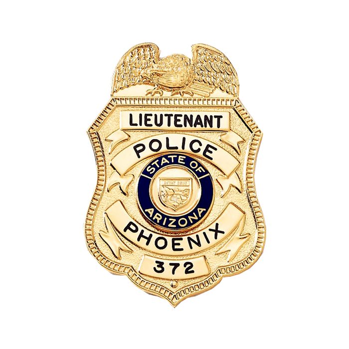 This classic shield badge with an eagle at the top includes a whopping four lines for lettering plus a neat riveted rim detail!