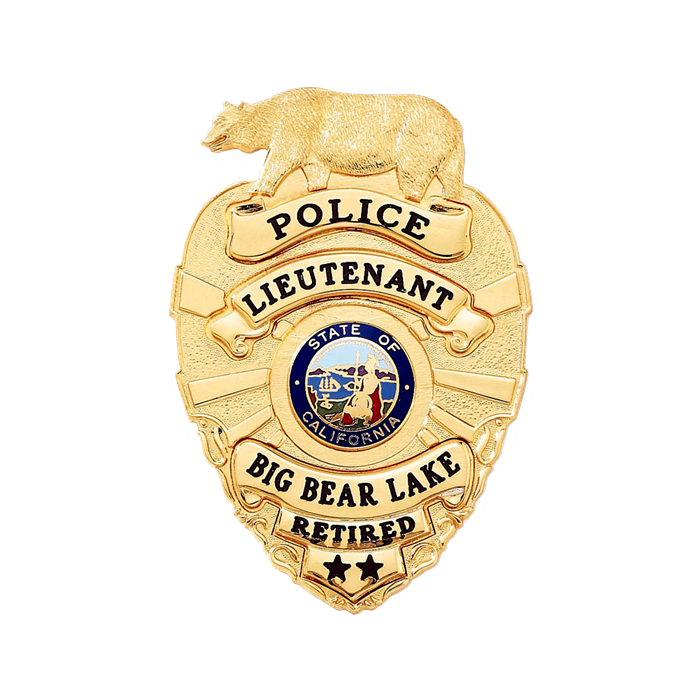This California bear-and-shield badge features multiple areas for lettering! The panels on this badge are applied. Solid back only badge. For a larger badge, use model B1613. Another bear top badge model is the B1970.