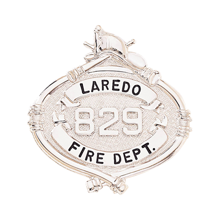 This classic horizontal oval fire badge features a helmet at the top and a fire hose rim with nozzles at the bottom!