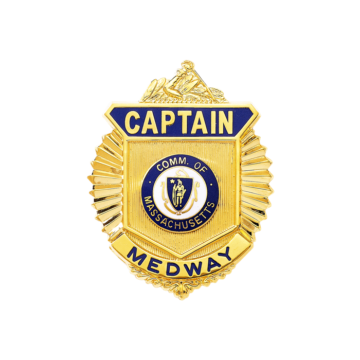 This version of the shield badge affectionately nicknamed "the radiator" features remarkable detail and your choice of lettering! Special reversed enamel panels can be made to drop into this badge. If top panel wanted use B2640. . Many standard titles are available. For titles/lettering we do not currently have in reverse enamel panels a nominal die fee will be charged.