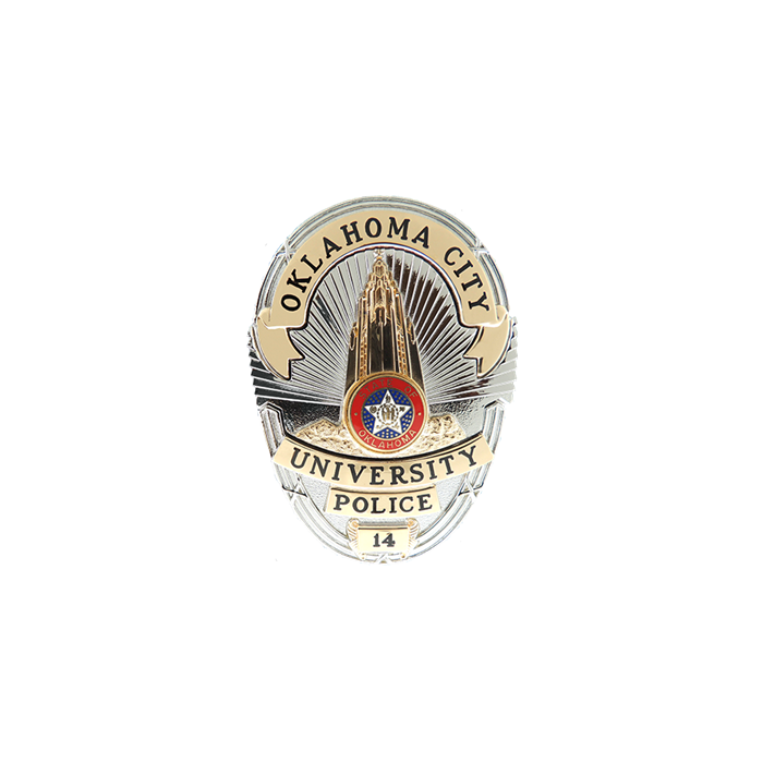 One of our most unique and versatile oval shields. We often call this badge a "building badge". This semi custom badge offers you an inexpensive way to create a truly unique badge. The middle of the badge is a custom panel insert. A great solution for departments looking to showcase a building or landmark. There is an extra set up fee to have a custom building panel created. Solid Back Badge.
