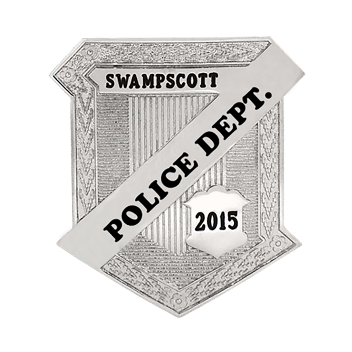 Decorative shield badge with diagonal panel that takes the lettering of your choice. For badge with a panel on top, use model B3399-APR. For badge with bigger diagonal letters, use model B3399-A.