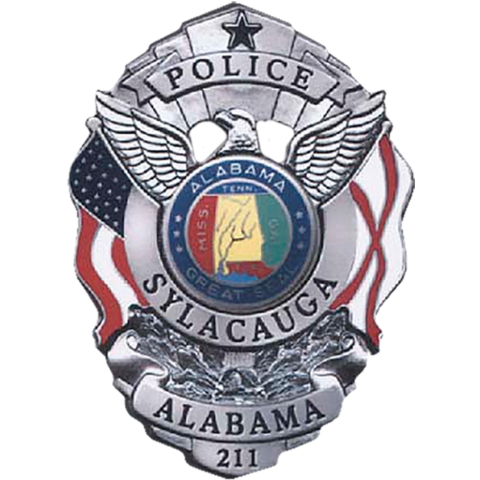 This unique shield features an eagle emerging from behind the seal with a flowing American flag on one side and the Alabama flag on the other side of the eagle. Full color flags in die. Star at top will be blue. Solid Back Badge.