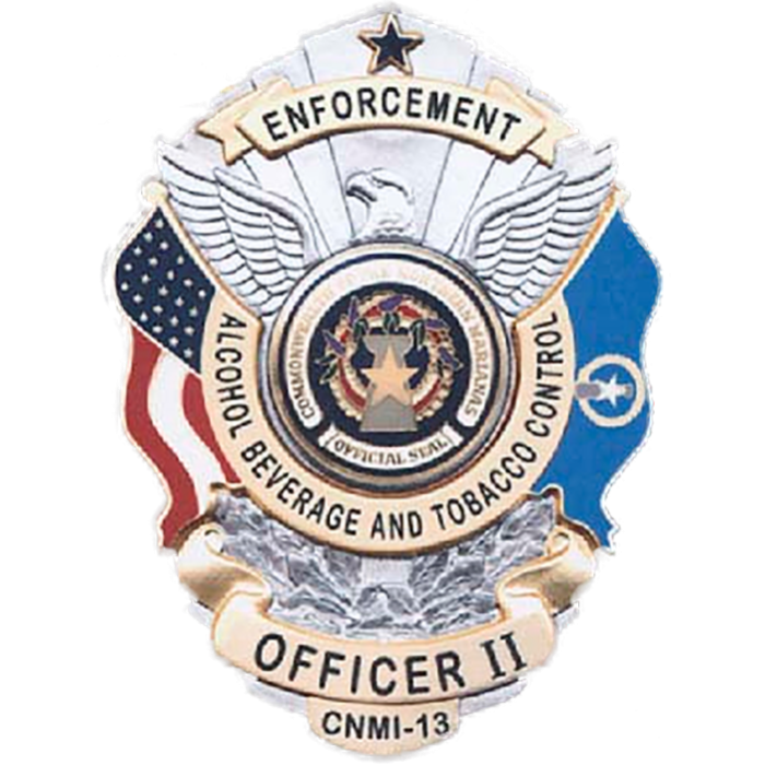This unique shield features an eagle emerging from behind the seal with a flowing American flag on one side and the Northern Mariana Islands flag on the other side of the eagle. Full color flags in die. Star at top will be blue. Bottom panel only takes regular enamel. Solid Back Badge.