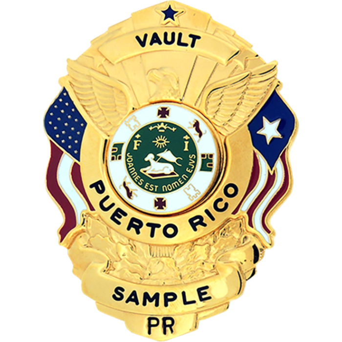 This unique shield features an eagle emerging from behind the seal with a flowing American flag on one side and the Puerto Rico flag on the other side of the eagle. Full color flags in die. Star at top will be blue. Bottom panel only takes regular enamel. Solid Back Badge.