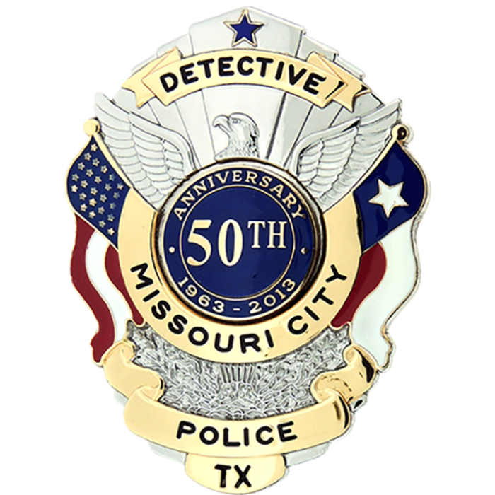 This unique shield features an eagle emerging from behind the seal with a flowing American flag on one side and the Texas flag on the other side of the eagle. Full color flags in die. Star at top will be blue. Solid Back Badge.