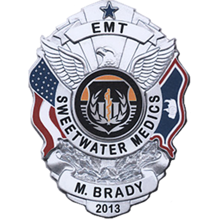 This unique shield features an eagle emerging from behind the seal with a flowing American flag on one side and the Wyoming flag on the other side of the eagle. Full color flags in die. Star at top will be blue unless otherwise specified. Bottom panel only takes regular enamel. Solid Back Badge.