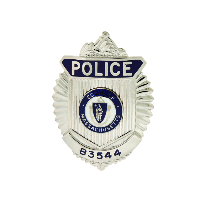Unique shield with the arm of the law above the police panel and a radiator style background. This is one of Massachusetts most popular badges. This style is similar to the B588 except the lines are thicker in the radiator area. POLICE panel is built into the die and cannot be changed. Available with either plain or enameled background. Use B2634 when titles other than "Police" are required. If top panel wanted use B587 except the lines will not be as thick.