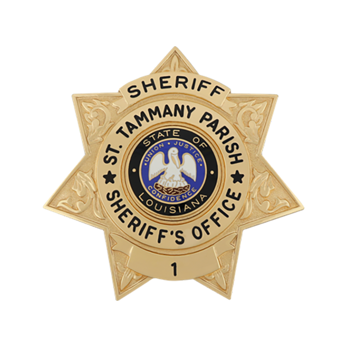 Decorative seven point star with decorative star points and four spacious areas that take the lettering of your choice. Stars on each side of the seal are in the die. For a smaller badge, see model B3599.