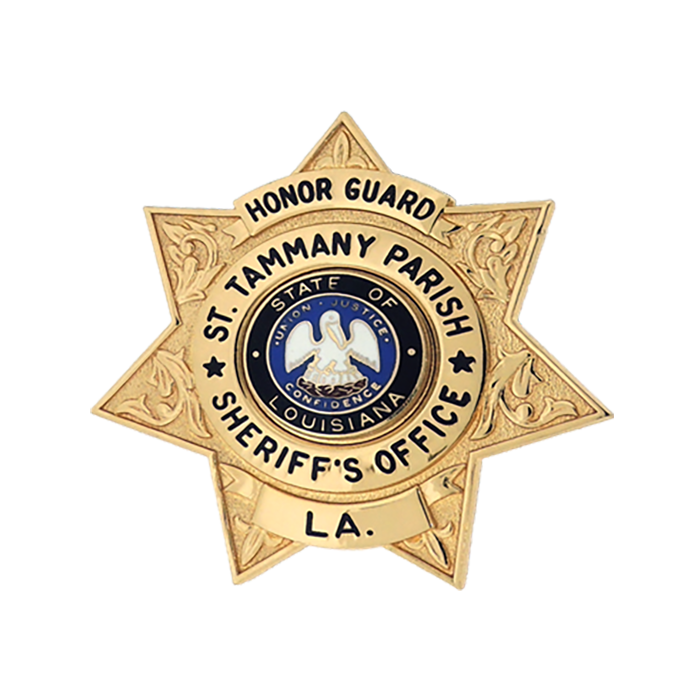 Decorative seven point star with decorative star points and four spacious areas that take the lettering of your choice. For a larger badge, see model B3556.