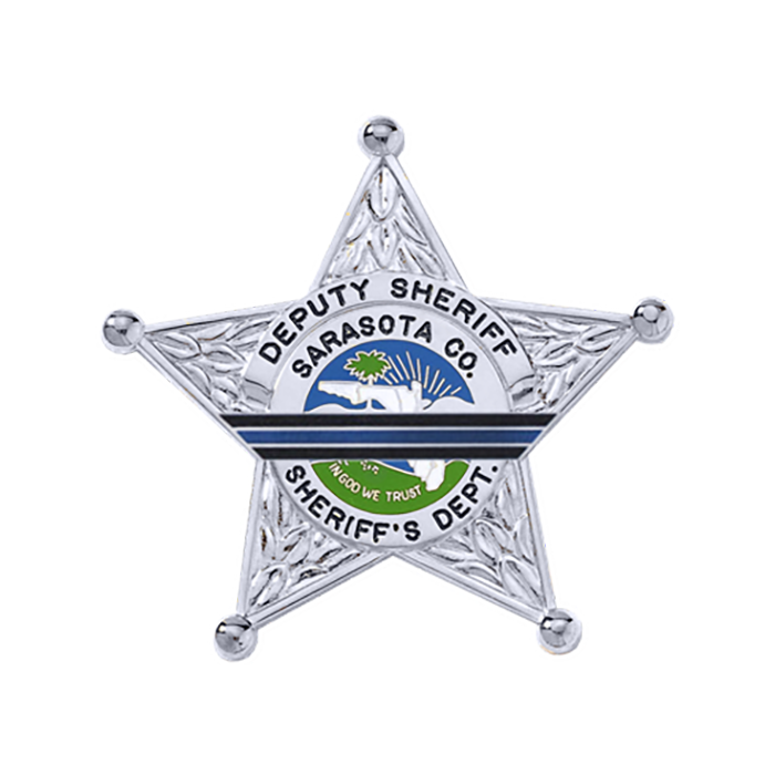 Blackinton's popular Florida 5 point star badge has been transformed into a memorial or remembrance badge. This version of the popular B1753 features three thin lines across the center with default colors black, blue, black. Choose any enamel colors for the lines: i.e., black, red, black, etc. Indicate line color in additional comments.