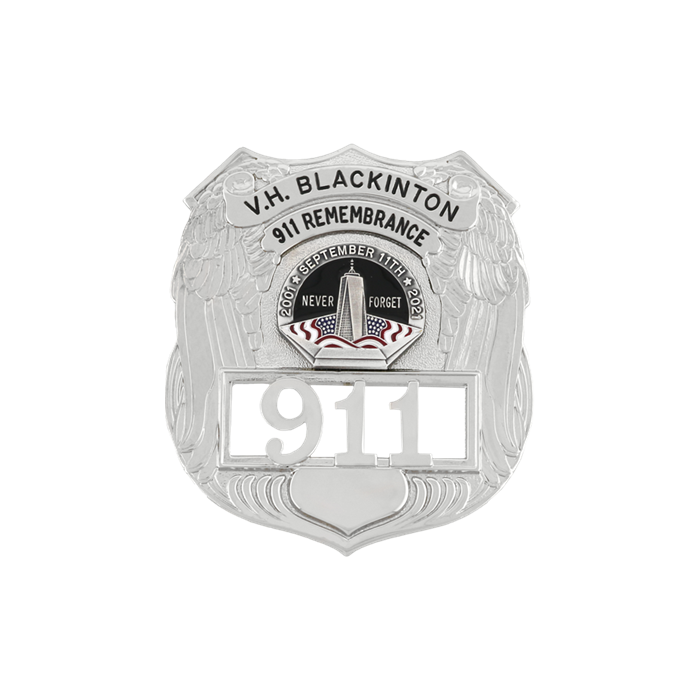Part of the 20th Anniversary 9/11 Remembrance line of badges and insignia. Our newest style features wings, applied seal, applied numbers on open panel and 3 lines of lettering of your choice.