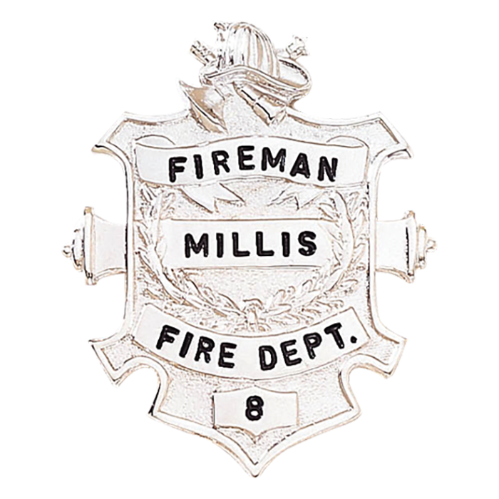 This small unique fire badge features a fire helmet on top with four areas that take the lettering of your choice.