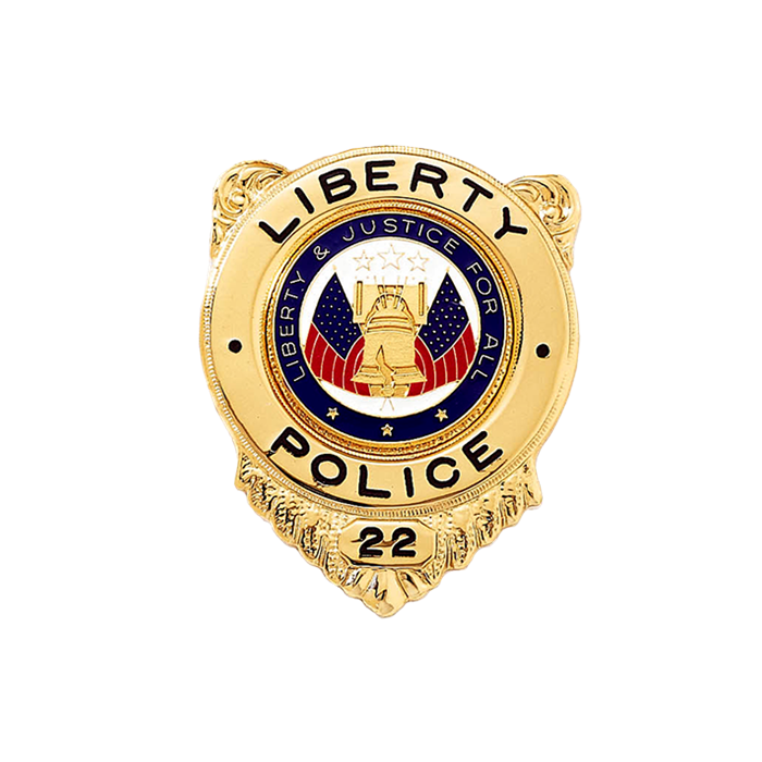 This impressive badge has a large round ring for lettering, plus an additional bottom area for initials or short numbers! This version does not include the eagle at the top.