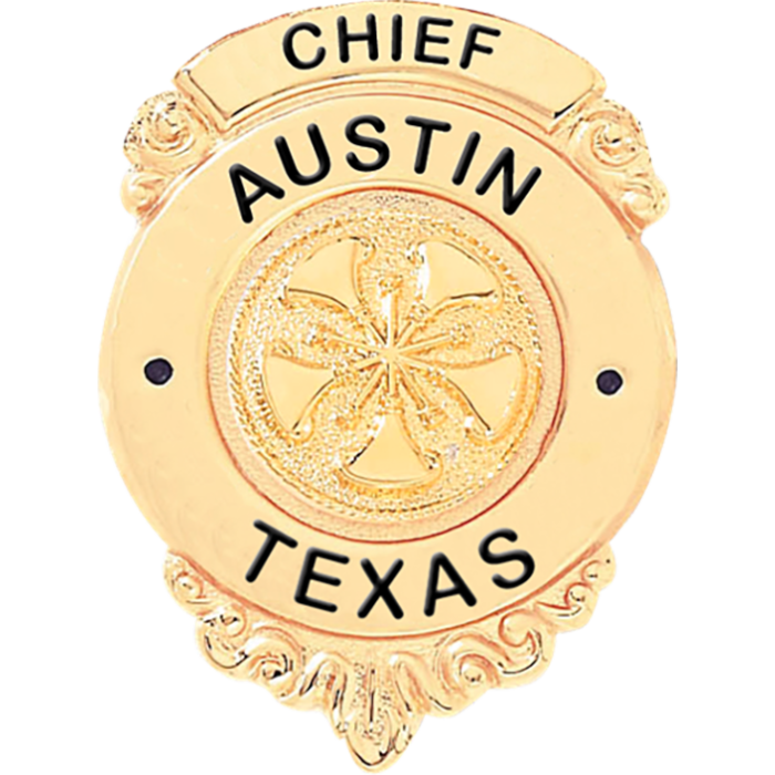 This unique badge features a circular center panel along with decorative top panel. If you would like this badge with an eagle on top please order the B532.