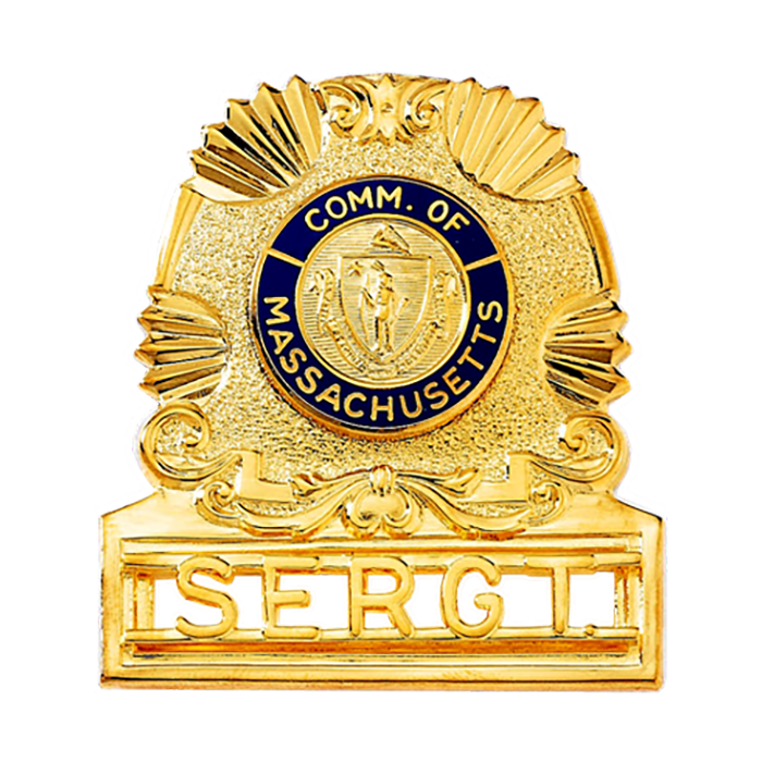 This ornate badge has plentiful space for a centerpiece, plus a rectangular open bottom area for applied letters or numbers! This badge is available with the Massachusetts Shield in place of the center seal. See model B1050.