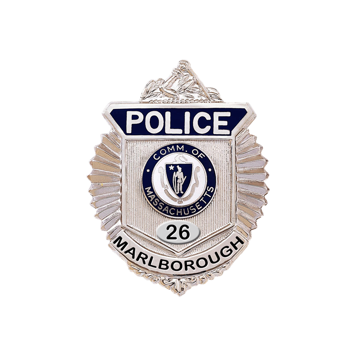 Unique shield with the arm of the law above the police panel and a radiator style background. The tab below the seal is now in die, not applied. If a top panel is needed, use B587-V2.